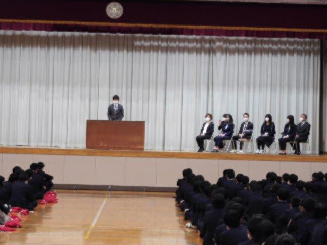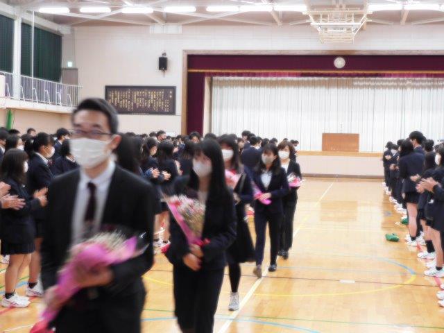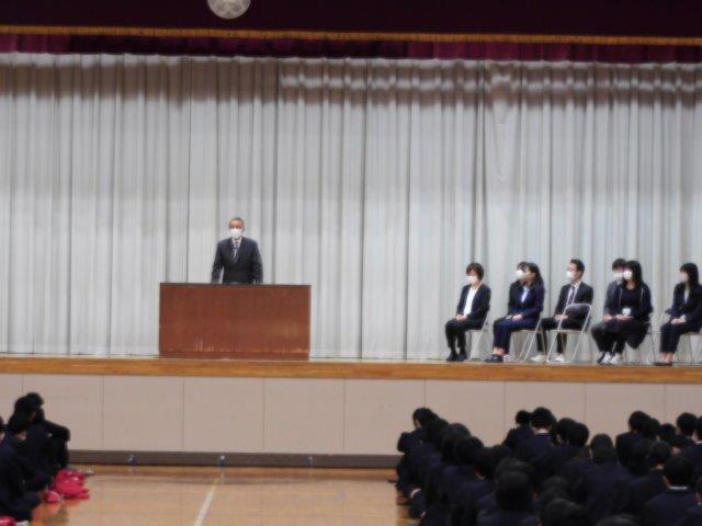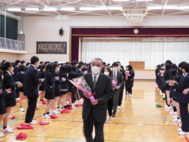 令和3年3月25日(木)の修了式後に、離任式を実施しました。本校の教育活動にご尽力いただいた先生方から、お一人ずつお言葉をいただきました。そして、最後に校歌を全員で心の中で歌いお別れをしました。本校を去られる先生方、これまで本当にありがとうございました。お体に気をつけて、次の環境でもがんばってください。そして、たまには本校の様子を見に来てくださいね。