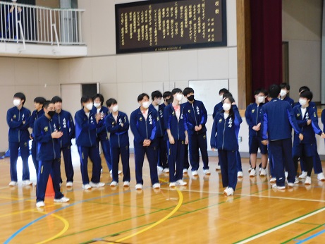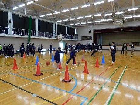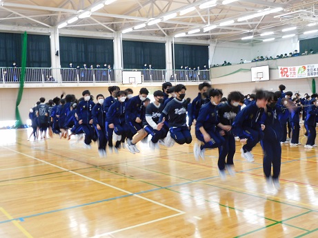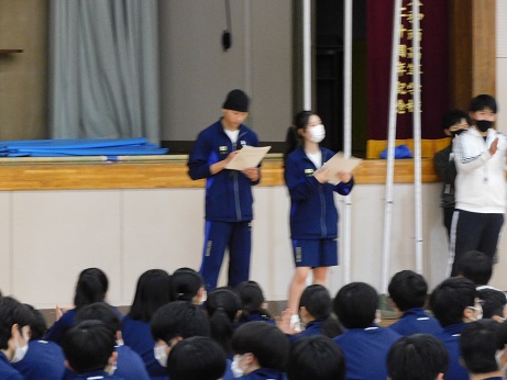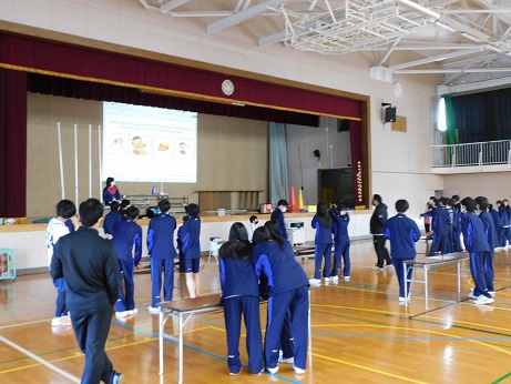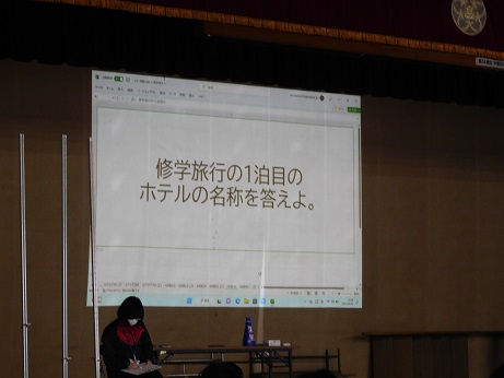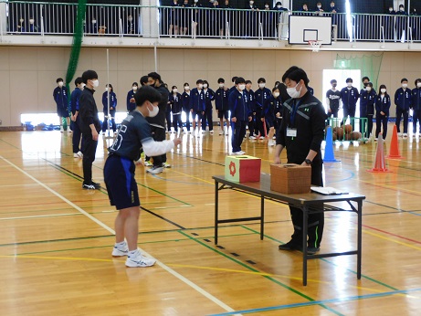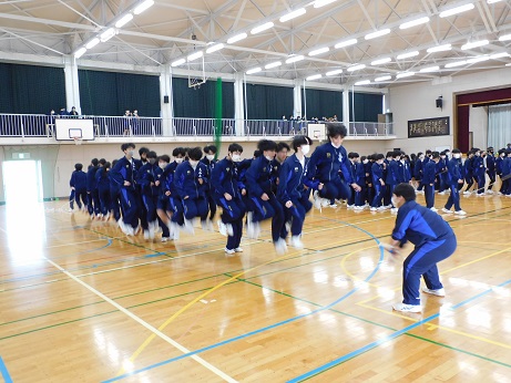令和5年3月15日(水)に本校体育館にて2学年のレクリエーションを行いました。今回は、クラス対抗で「大繩跳び」、「クイズ」、「障害物リレー」の3つの競技を行いました。「大縄跳び」では、クラス全員で跳んだ回数をカウントしていきました。「クイズ」では、国語・数学・英語など各教科からの内容や、なぞなぞ・45期生に関するクイズなど様々なジャンルからの出題がありました。生徒は3人1組で回答していきました。「障害物リレー」では、ピンポン玉をおたまにのせた状態で、様々な障害物をクリアしていくというものでした。今年度最後の学年行事ということもあり、大変盛り上がるものとなりました!結果は、「大縄跳び」の1位が2組、「クイズ」の1位が4組、「障害物リレー」の1位が1組、そして総合優勝が2組でした!