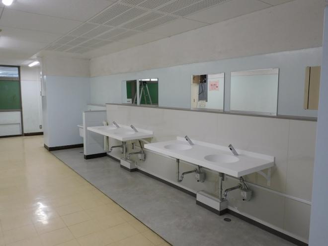 令和3年の9月から行われていた北棟(主に1年・2年の教室)の耐震化工事が終了しました。この工事に伴い、1階に多目的トイレが新設され、各階のトイレがきれいになりました。また、廊下の流しも新しくなり、廊下の電灯も明るくなりました。