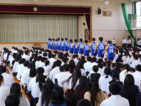 6月1日(土曜日)にトッケイセキュリティ平塚総合体育館、2日(日曜日)に小田原アリーナで行われる関東大会に出場します。顧問による出場選手の紹介、選手による大会への抱負、生徒会と校長先生による激励の言葉がありました。また、最後には選手に向けて、全校生徒から迫力のあるエールが送られました。