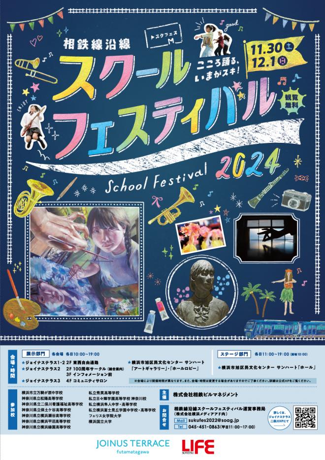 2024年11月30日(土曜日)、12月1日(日曜日)に開催される相鉄線沿線スクールフェスティバル2024に、本校から美術部・写真部・漫画研究部・ダンス部・フォークソング部が参加します!