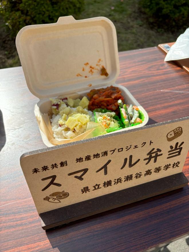 瀬谷にあるたまごcafeごはんさんに協力いただき、横浜産のお肉「はまポーク」を使ったハンバーグの他、地元の野菜を使ったポテトサラダなどを含め、彩がよくおいしいお弁当を作ることができました。