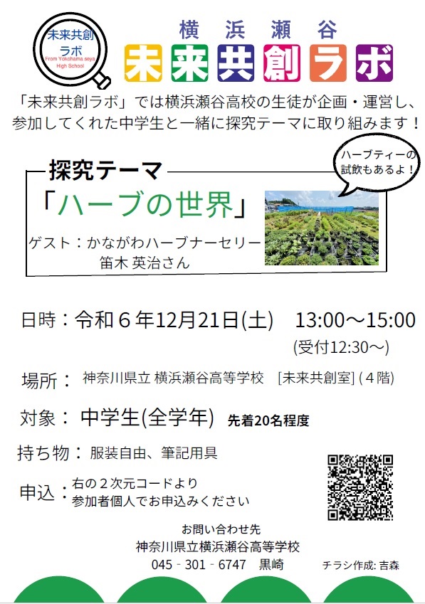 「未来共創ラボ」は、横浜瀬谷高校の高校生が企画・運営して、中学生と共に探究テーマに取り組む探究講座です。