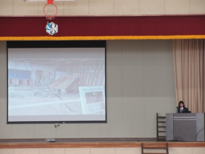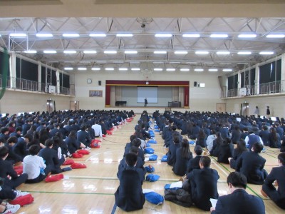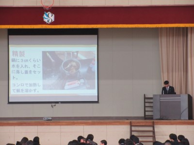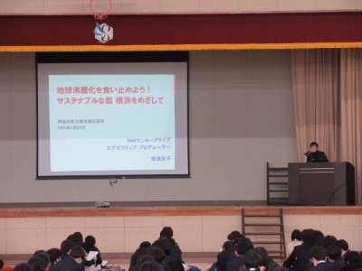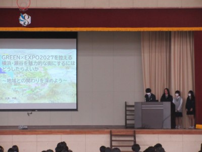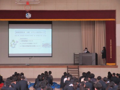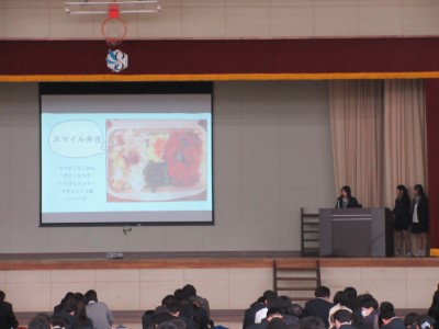 前半は企業講話を聞き、後半は各学年から選出された2~3グループが、プレゼンテーションによる発表を行いました。