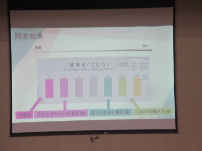 1年生は「瀬谷を魅力化」を主テーマとして探究がすすみます。瀬谷を魅力的な街にするために、ごみの削減を考えるなかで、実際に水質調査を行った。CODのパッチテストを用いて、汚れの度合いを科学的に測ったところ、川の水流の強弱や、ゴミのせき止めによって、水質の良し悪しが変わってくることに気が付いた。ゴミ拾いの過去の取り組みについても調べるなかで、ごみの削減と向き合う大切さを学んだと話します。