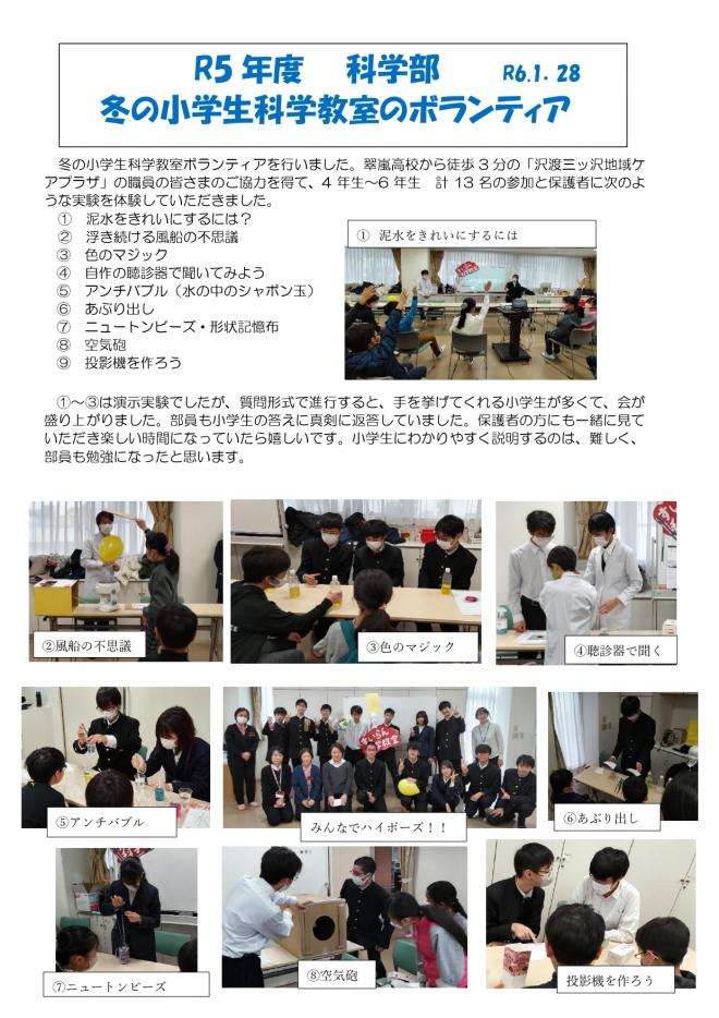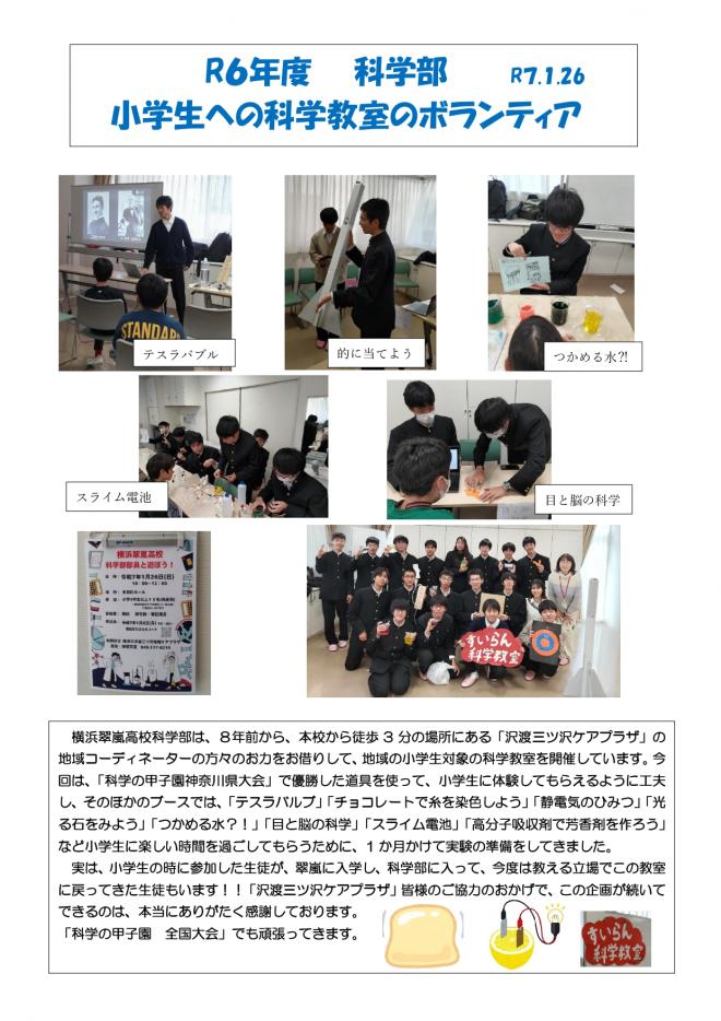 翠翔祭では、ピタゴラスイッチの制作、化学系の演示実験や体験できる実験の発表を行い、来校された地域の方や小学生に楽しんでいただいています。秋には「科学の甲子園神奈川県大会」のための筆記競技、実技競技に向けて2か月取り組みます。令和元年度には神奈川県の公立高校として初めて県大会で総合1位を獲得することができました。平成28年度から始めた地域小学生への「科学実験教室」は地域ケアプラザのご協力のもと、夏と冬に行い、参加者に毎回喜んでいただいています。 科学部は自由な雰囲気のため、自分のやりたい実験・研究をすることができます。