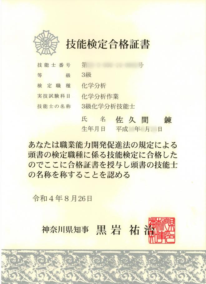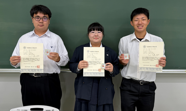 化学科3年生3名が国家資格である【3級化学分析技能士】に合格をしました!3級化学分析技能士とは、身近な化学製品の安全性を確かめたり、環境への影響を与えることがないかを確認したりするなど様々な物質を化学的に分析できる知識や技術を有する人に与えられる資格になります。資格を取得するためには学科試験と実技試験に合格する必要があります。資格試験に向けての勉強や実技試験への対策など熱心に取り組んでいました。合格おめでとうございます!