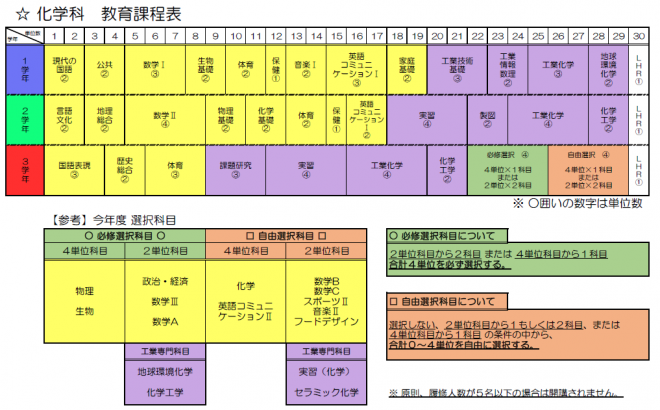 化学科では普通科の科目に加えて工業科目である工業化学や化学工学、地球環境化学、化学実習など多くの専門科目を学ぶことができます。工業化学や化学工学では化学に関する基礎学習を行い、化学実習では水の分析や医薬品の合成実験などを通して器具の扱い方や分析機器の使い方などの実験技術を身につけます。詳しい授業は【化学科教育課程表(PDF:68KB)】をチェックしてください!