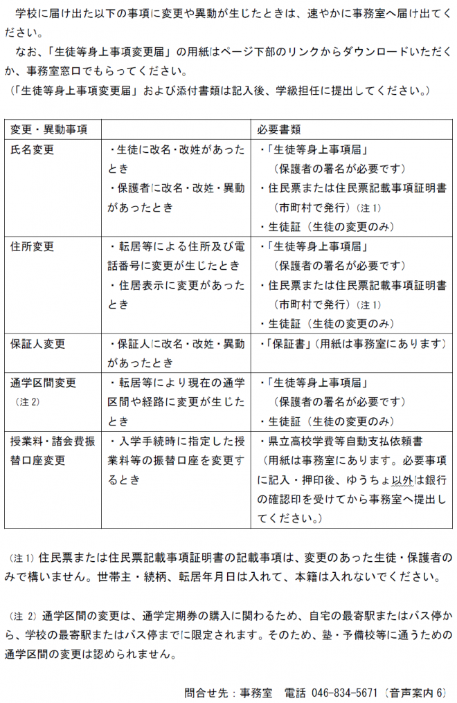 横須賀南高等学校 > 在学生・保護者の方へ > 事務室 > 氏名や住所、保護者等に変更があったときは