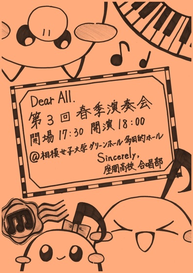 演奏会のお知らせ2025年3月28日(金曜日)に、合唱部単独の演奏会「第3回 春季演奏会」を以下のように執り行いました。多くのお客様に来場いただき、ありがとうございました。