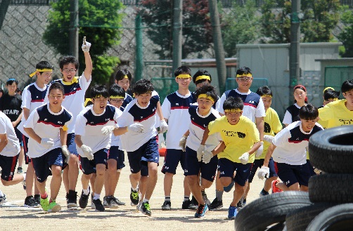 全校生徒が赤・青・黄の3色の団に分かれて競技を行い、得点を競い合います。